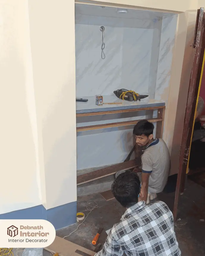 At Debnath Interior, we always look forward to new opportunities to enhance living spaces with thoughtful and functional designs. Our latest project focuses on three essential elements: a beautiful pooja mandir, a fully customized wardrobe, and an elegant basin area. Through careful planning and execution, we aim to create a harmonious blend of aesthetics and practicality.